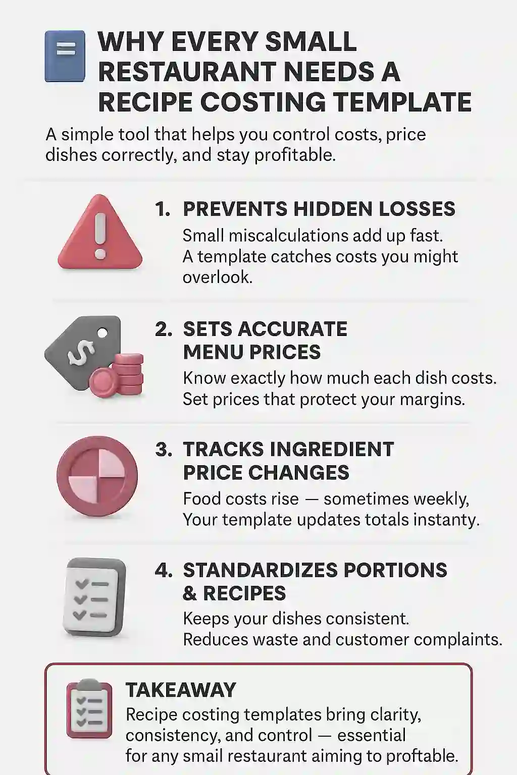 - Small restaurants operate on razor-thin margins—costing templates protect profitability.